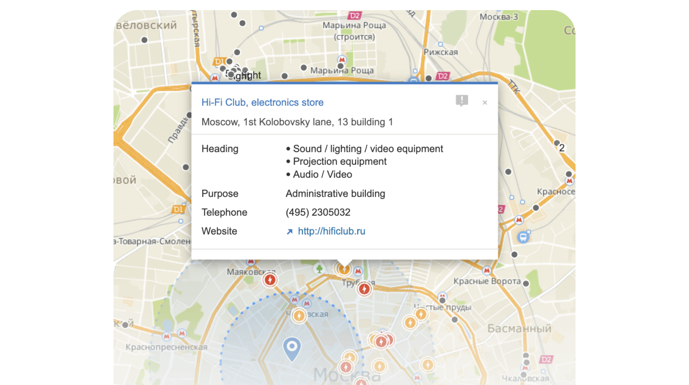 With recommendations of the business navigator, users choose locations for business and analyze competition and real estate. Thus, the map should reflect information about buildings, social and business infrastructure, and transport accessibility in as much detail as possible.